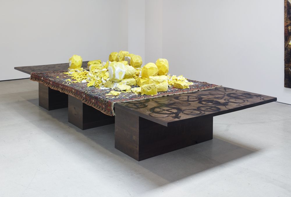 Rashid Johnson, Untilted (Shea Butter Tabler), 2016. Shea butter, Persian rug, branded walnut. Private Collection © Rashid Johnson, 2025. Picture: Martin Parsekian
